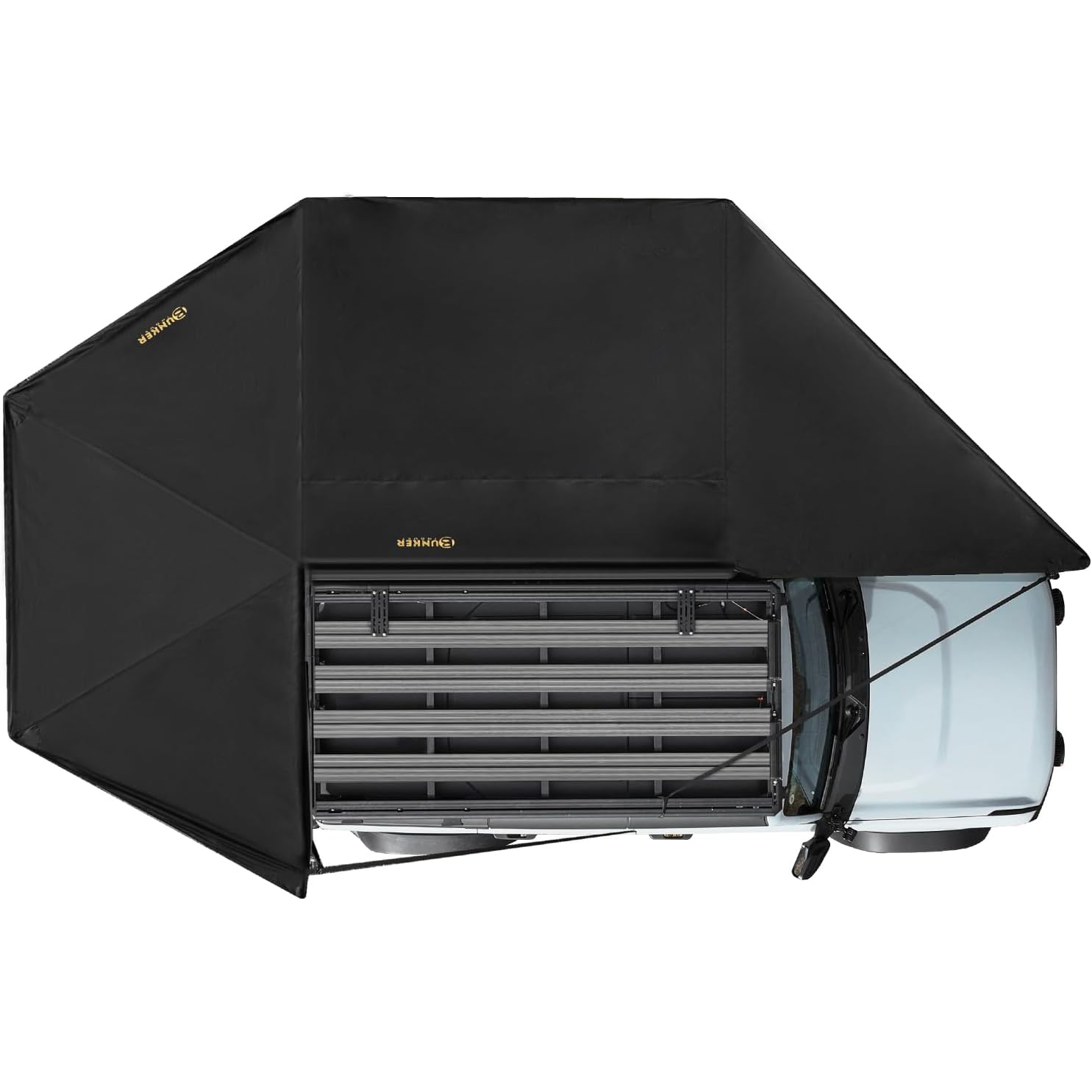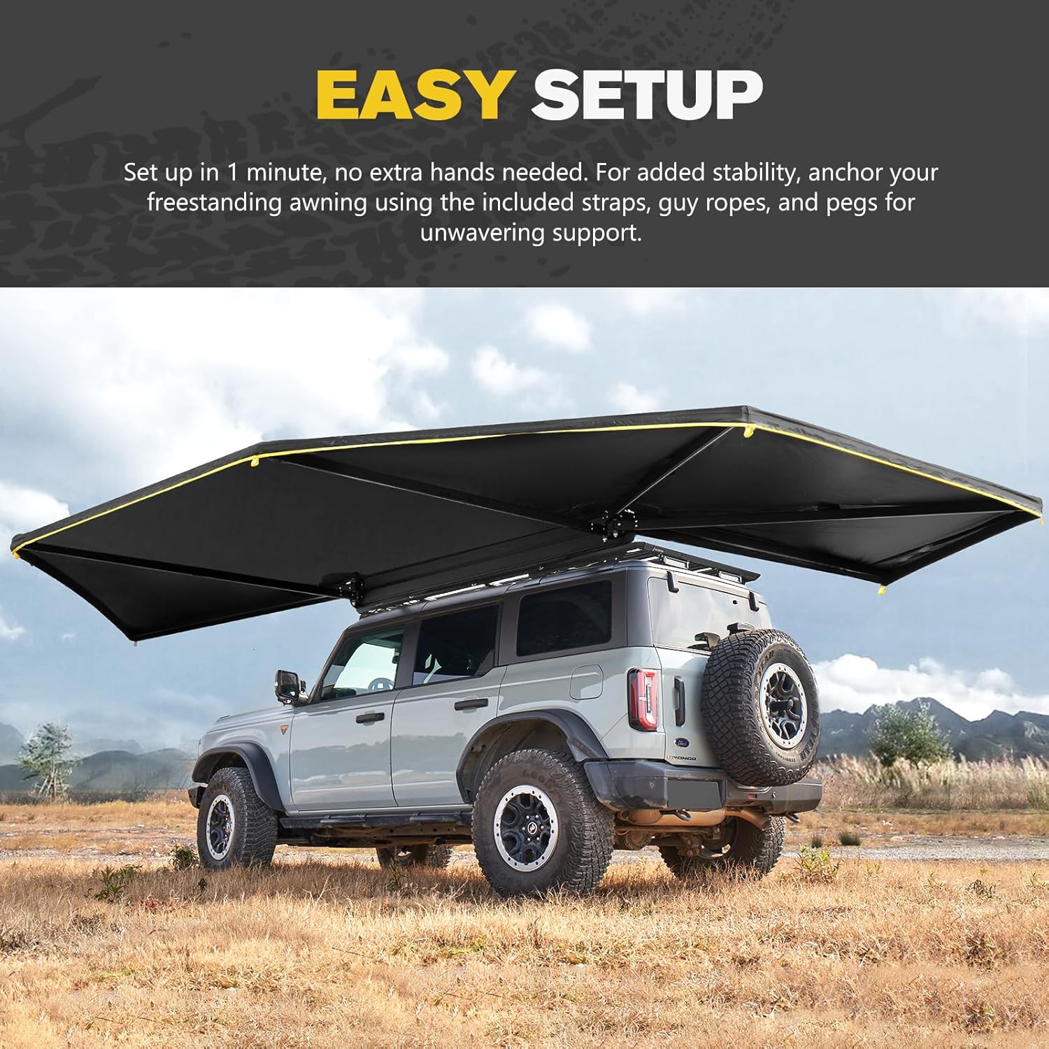 A freestanding, vehicle-mounted shelter designed for overland enthusiasts seeking quick setup and reliable protection from the elements. Built with a rugged central hub and reinforced arms, it offers stable, wind-resistant coverage up to 107.6 square feet, making it ideal for cooking, relaxing, or camping beside your SUV, van, truck, or camper. The awning is constructed from 300D double-ripstop Oxford fabric with waterproof tape, delivering 3,000mm waterproofing and UPF50+ sun protection. Stainless steel knuckles, powder-coated aluminum poles, and PVC reinforcements ensure durability in harsh conditions. A standout feature is its integrated three-color LED lighting system, offering bright white, sunlight white, and amber modes for versatile illumination, including bug-reducing options for nighttime use.