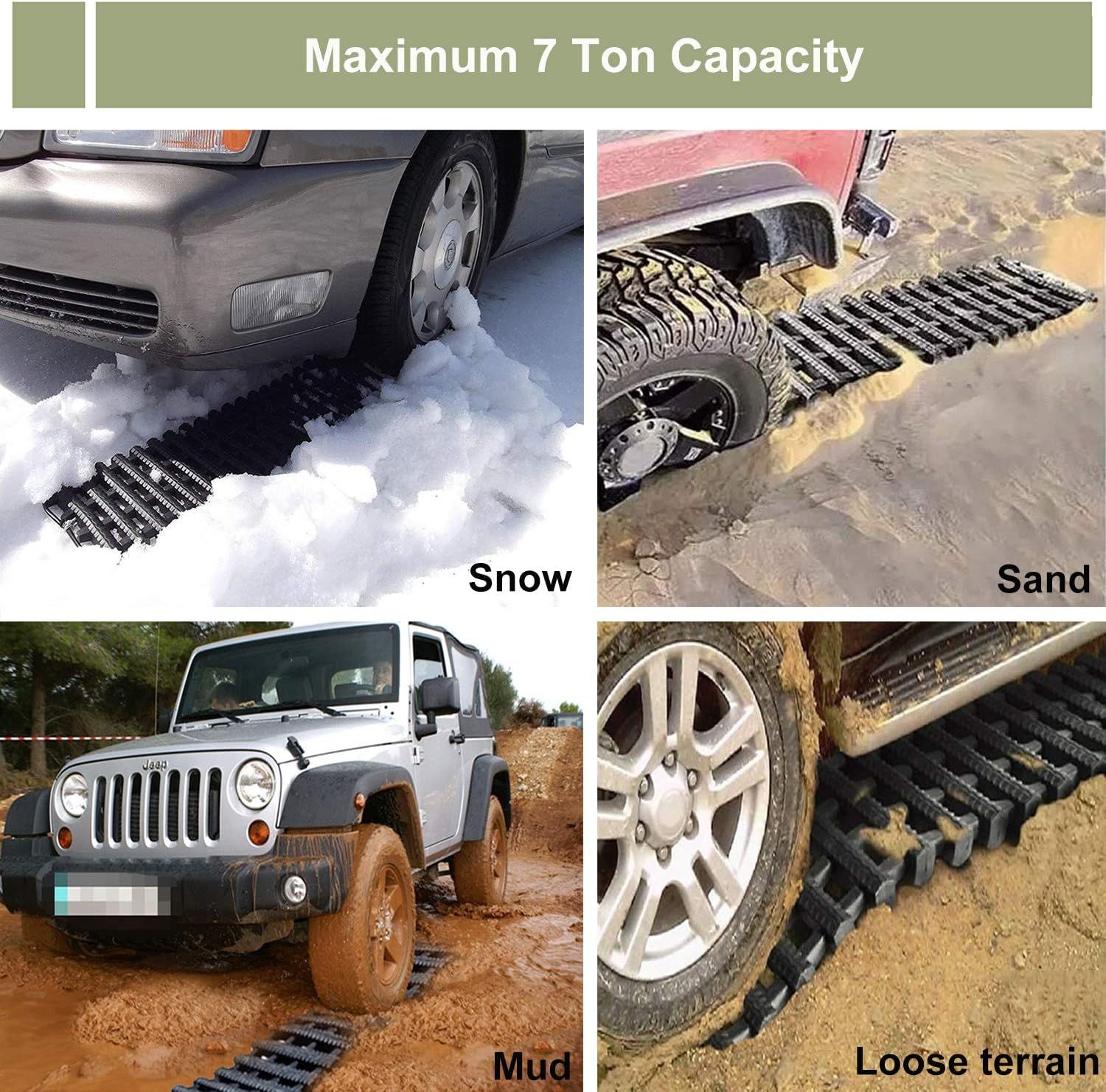 This traction track mat is the perfect alternative to potentially harmful tire chains. It is a must-have automotive safety accessory for any intrepid off-roaders or anyone who drives anywhere bad weather .Enhanced materials and workmanship provide maximum grip to prevent your vehicle's tires from spinning when stuck in snow, mud, ice, sand or any type of loose terrain. Combined super tough engineering-grade reinforced TPR with galvanized steel connecting cables are incredibly durable and can support vehicles weighing up to 7 tons. Anti-skid textured surface are specially designed to suit most terrains and offer ultimate firm base against slippery and unstable ground.