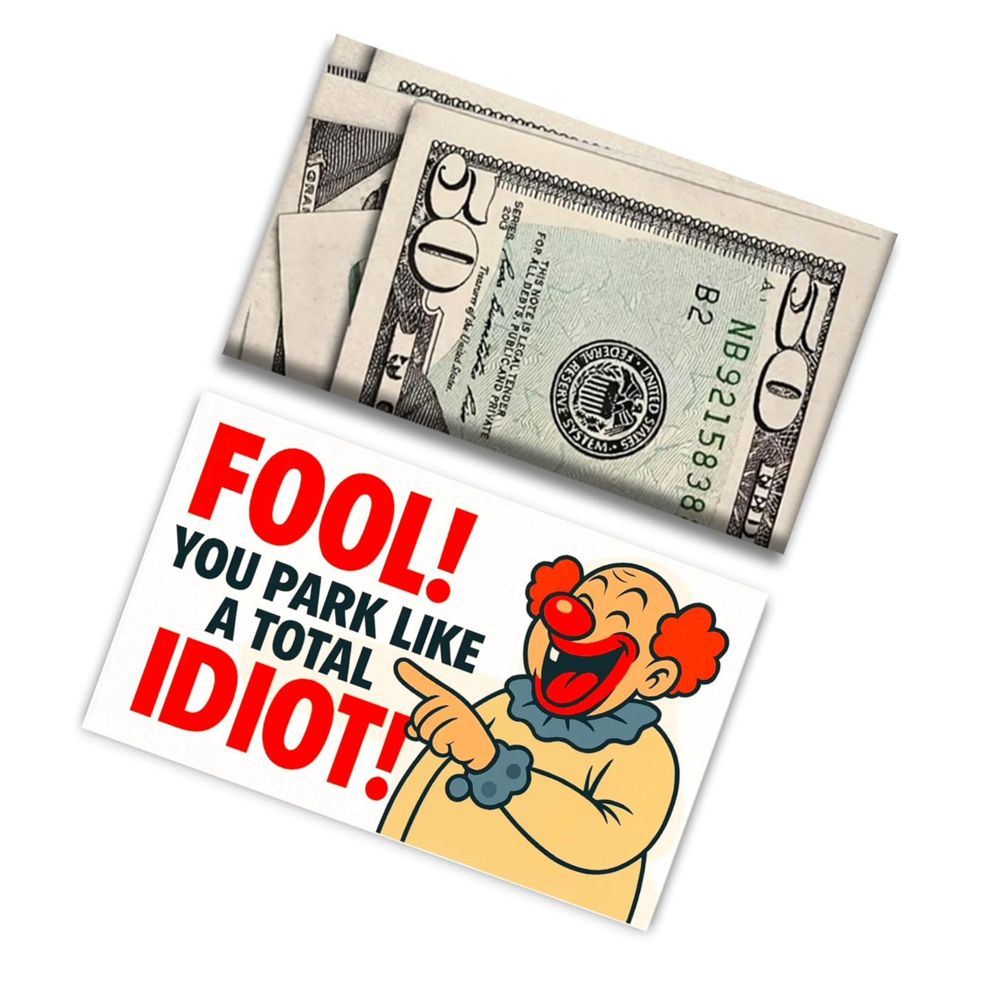 The Bad Parking Prank Cards – “You Park Like a Total Idiot” edition are a humorous way to call out poor parking in a cheeky, non-confrontational style. Each card is printed on heavyweight matte business card stock and designed to resemble a folded $50 bill from a distance, tricking the recipient into thinking they’ve found cash. Once flipped, the bold red message “FOOL! You Park Like an Idiot!” delivers the punchline. The pack includes 50 cards, making it easy to prank an entire parking lot. These cards are suitable for use on cars, trucks, motorcycles, golf carts, and more—anywhere bad parking strikes.