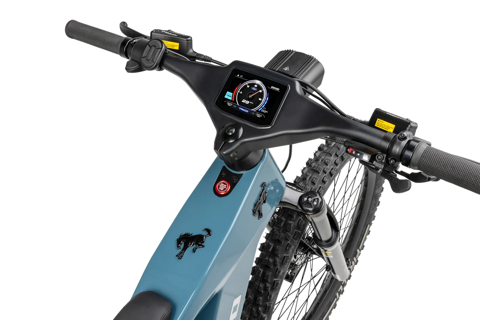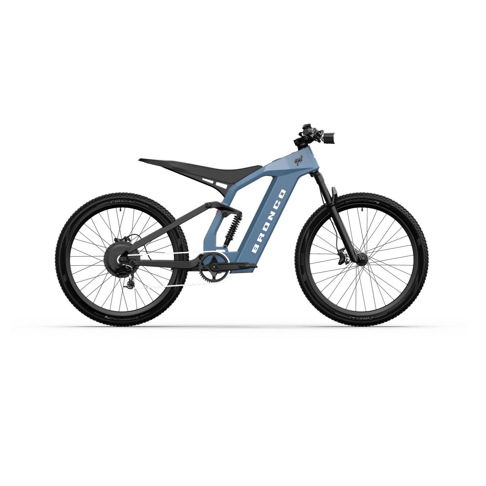 The Bronco eBike features a custom G.O.A.T.™ (Goes Over Any Type of Terrain) suspension system, including a 120mm air-sprung front fork and a 190x50mm coil rear shock, designed to keep the wheels grounded and absorb trail impacts. Its moto-style saddle allows riders to shift weight easily for maneuvering over obstacles, while Pirelli Scorpion Enduro M Hardwall tires offer exceptional grip on roots, rocks, and riverbeds.