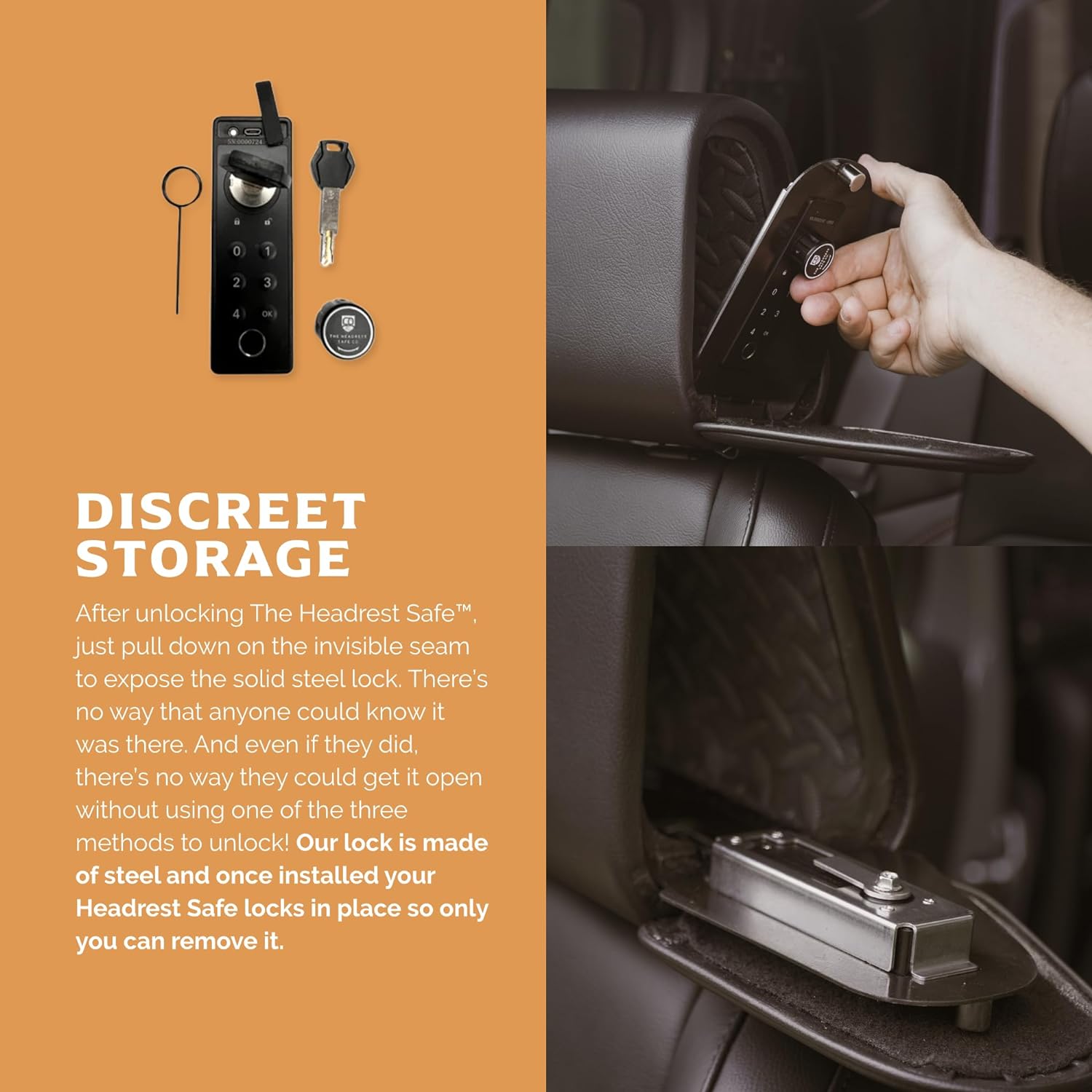 Includes a passenger seat headrest with a built-in safe and a companion driver-seat headrest without a safe. The safe is designed to securely store valuables, such as firearms, with three access methods: biometrics, keypad, and hard key. The headrest is made from 18-gauge steel with a 16-gauge steel safe door, ensuring durability and security. It is designed to match the companion headrest for a seamless look and meets the standards required for original equipment manufacturers.