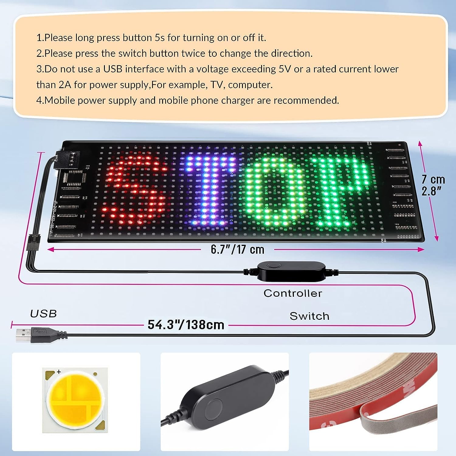 A flexible, app-controlled LED display panel designed for vehicle windows, allowing users to show custom messages, animations, or emojis. This 6.7" x 2.76" LED panel is powered via USB and connects to your smartphone through Bluetooth using the dedicated app. Users can program scrolling text, graphics, or animations in multiple languages and styles, making it ideal for rideshare drivers, event promotion, or personal expression. The panel is made from a flexible, lightweight material that adheres easily to car windows or other smooth surfaces. It features adjustable brightness, multiple display modes, and supports real-time updates from your phone. Whether you're advertising a business or just having fun, this LED sign offers a creative and eye-catching way to communicate on the go.